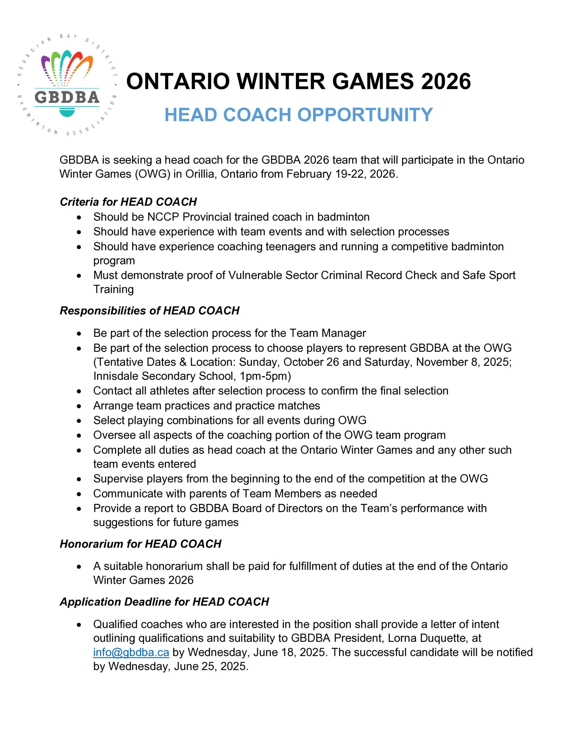 We’re very excited that the Ontario Winter Games will be held in our District next year from February 19-22, 2026. GBDBA is looking for a Head Coach and Manager. Please refer to the details and if interested in submitting a letter of intent, deadline for submissions is Wednesday, June 18.